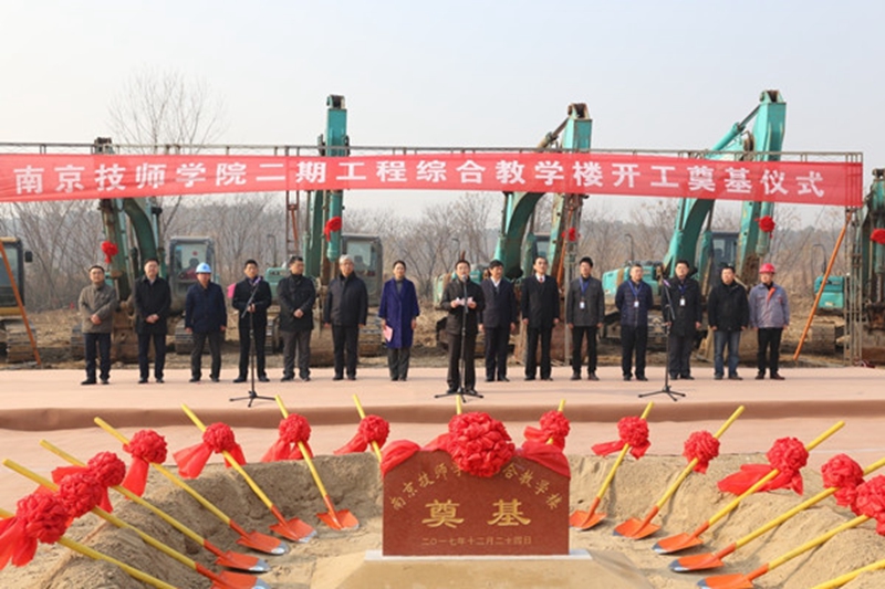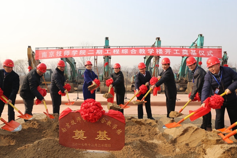 奠基仪式上,刘莅局长致辞并宣布项目开工。刘局长指出,二期工程开工对学院具有里程碑式的意义,学院作为全市唯一一所省重点技师学院,多年来紧贴地方经济发展大局,积极探索技能人才培养新模式,致力打造蓝领“中产阶层”,为“南京制造”、“南京创造”培养和输送了大量高技能人才。他表示,学院上下要以二期工程建设为契机和抓手,继续坚持“就业为导向、技能为核心、教育为本位”的办学思路,不仅建好“硬件”,更要以提升学院品质为着力点,做实“软件”,以“转型升级、内涵发展”为目标,促进教育内涵发展由“物质层面”不断向“精神层面”推进。要强化专家指导、精品引领,提升专业建设水平,使二期工程建设与学院发展目标同步,功能布局与实际教学需要同步,发展空间与转型拓展同步。以项目培养、攻关培养、互联培养、大师培养“四项”培养模式推动校企融合发展。着力于人才培养模式与课程体系改革,努力培养“下得去、留得住、用得上”的专业技术技能型人才。注重强化技能人才国际国内交流与合作,打造高水平集训基地,扎实推进“世赛青苗班”组建,在世界技能大赛及各级大赛上努力实现新突破。他要求,学院全体教职工要本着高度负责的态度,积极配合,密切协调;希望学院及负责施工的南通四建、负责监理的苏宁建设以及负责跟踪审计的捷宏润安等参建单位,牢固树立安全至上、质量第一的责任意识,按照职能分工,各负其责,文明施工,严格把关,精益求精,做到守合同、重信用。他强调,项目奠基只是个开始,下一步关键要早干、快干、实干;要进行行之有效的监督管理,确保干事干净,以过硬的作风和干劲,确保二期工程建设实现“工程优质、队伍优秀”。