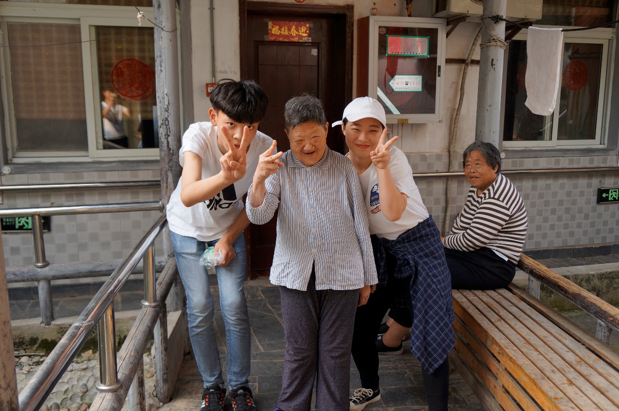 紧接着我们陪伴着一位口齿不清的老奶奶,老奶奶看到我们的到来很开心的样子一个一个和我们握手。 我们带着老奶奶进行了合影,老奶奶和我们一起比了手势呢。老奶奶,祝你寿比南山!
