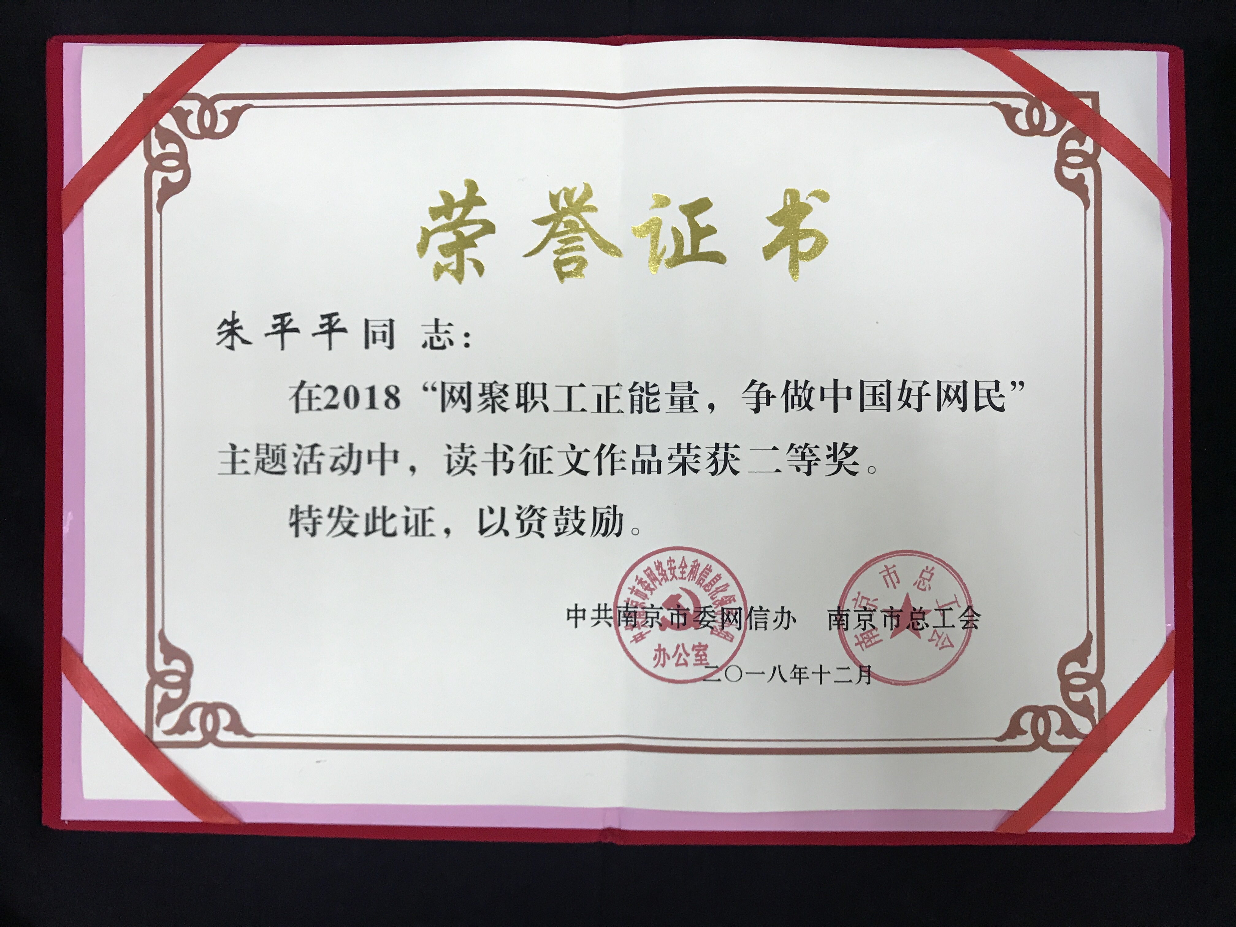 2018年市总工会联合市委网信办首次开展“网聚职工正能量 争做中国好网民”主题活动,主要内容是“五个一”网络作品征集和展示:一部公益广告(视频和海报),一幅“画面故事”,一篇“网络好职工”读书征文,一段“网言网语”,一个“我为南京发展作贡献”金点子。我院机械系教师朱平平的“我遇到你,是最美好的开始--敬一丹《我遇到你》读后感”荣获征文作品二等奖。