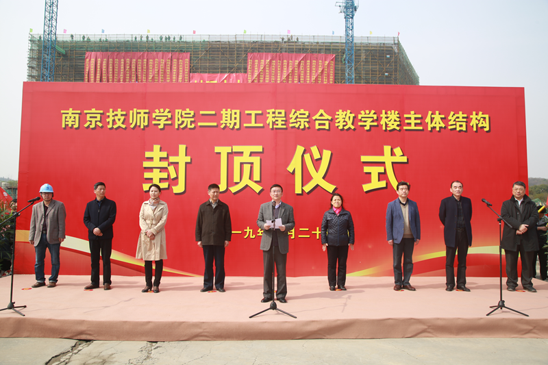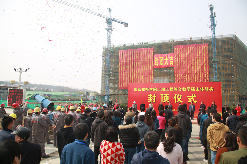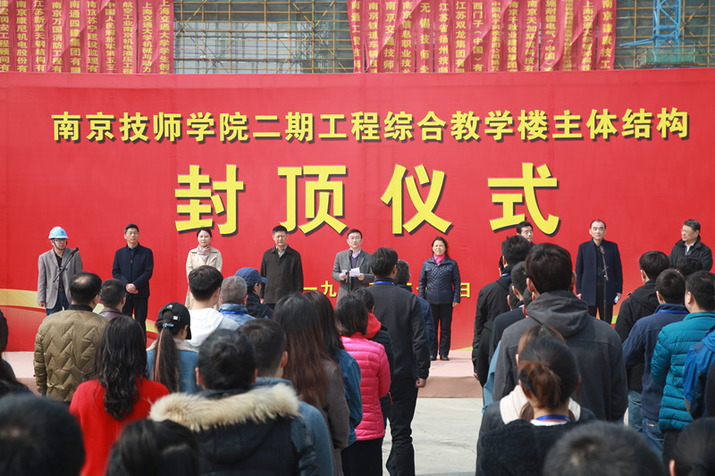 3月24日上午,MK在线(中国)唯一官方网站举行二期工程综合教学楼主体结构封顶活动。市人社局党组书记、局长刘莅,仙林大学城管委会党工委委员、副主任孙金娣,市人社局巡视员周政学,副巡视员郁永春,江苏省建筑设计研究院有限公司、南京苏宁建设监理有限公司、南通四建集团有限公司等参建单位负责人以及学院部分教职工代表约100人参加活动。