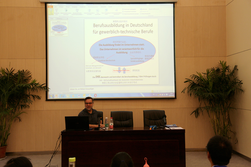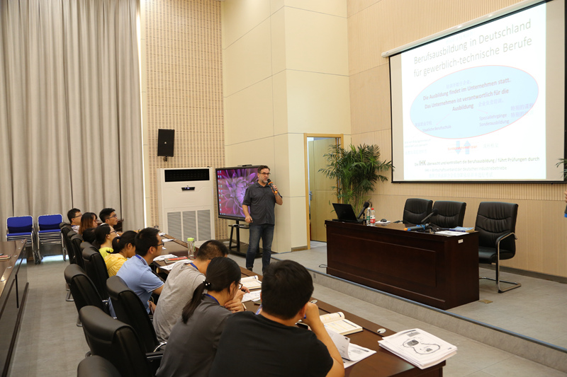 围绕“德国先进加工技术基本情况以及德国先进职业教育如何开展”的主题,Steffen Baumann既把德国职业教育的成功经验倾囊相授,又把德国职业教学法贯穿培训全过程。他提醒参培教师,在以后的教育教学实践中一定要让课堂动起来、活起来,在活动中检验学习成果。参培教师都非常珍惜本次培训机会,严格遵守培训要求,积极参与问答与讨论,课堂气氛热烈而富有秩序。