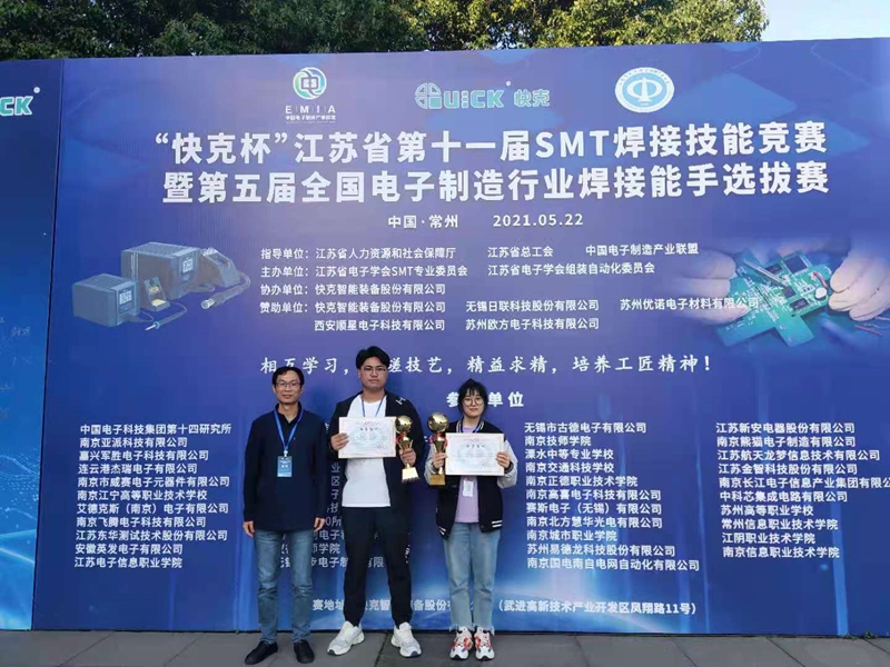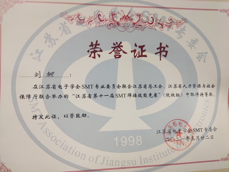 5月22日,在江苏省第十一届SMT焊接技能竞赛中,我院电气工程系16电子高职班刘柳、张中明两名学生与来自各大企业和中高职院校共计85名高手同台竞技,发挥出色,脱颖而出,取得了学生组特等奖和二等奖的优异成绩。