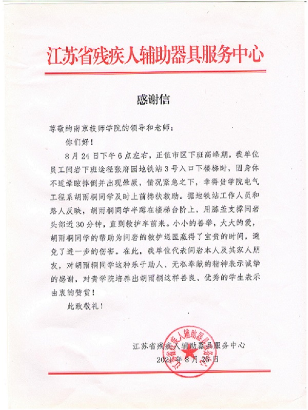 2021年96日是我院教职工第一天上班的日子,一大早我院就收到了江苏省残疾人辅助器具服务中心寄来的感谢信,信中满溢赞赏情怀,向电气工程系19环保(水处理技术)高级班(班主任:郭文娟)胡雨桐同学乐于助人的行为及学院表达了感谢。