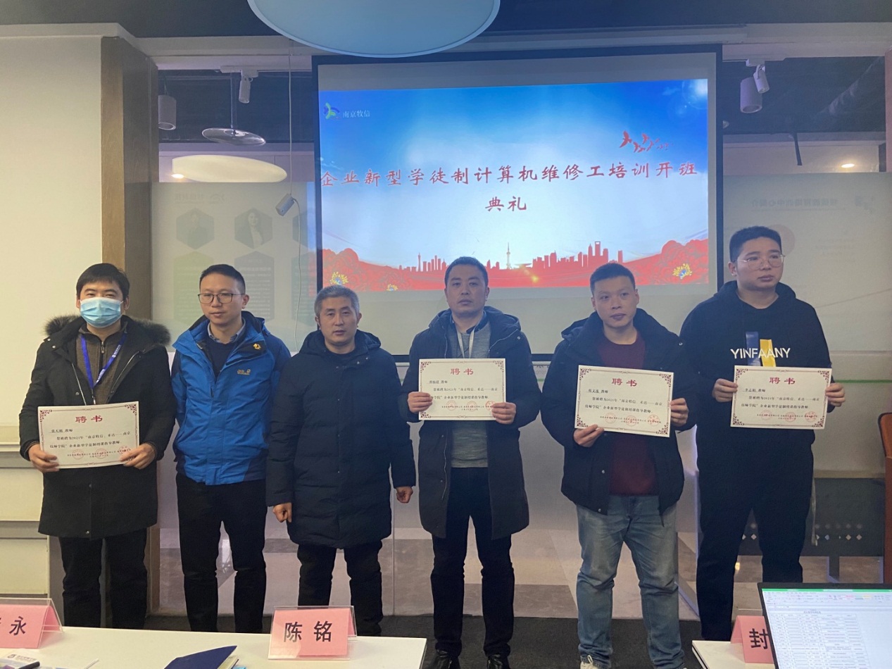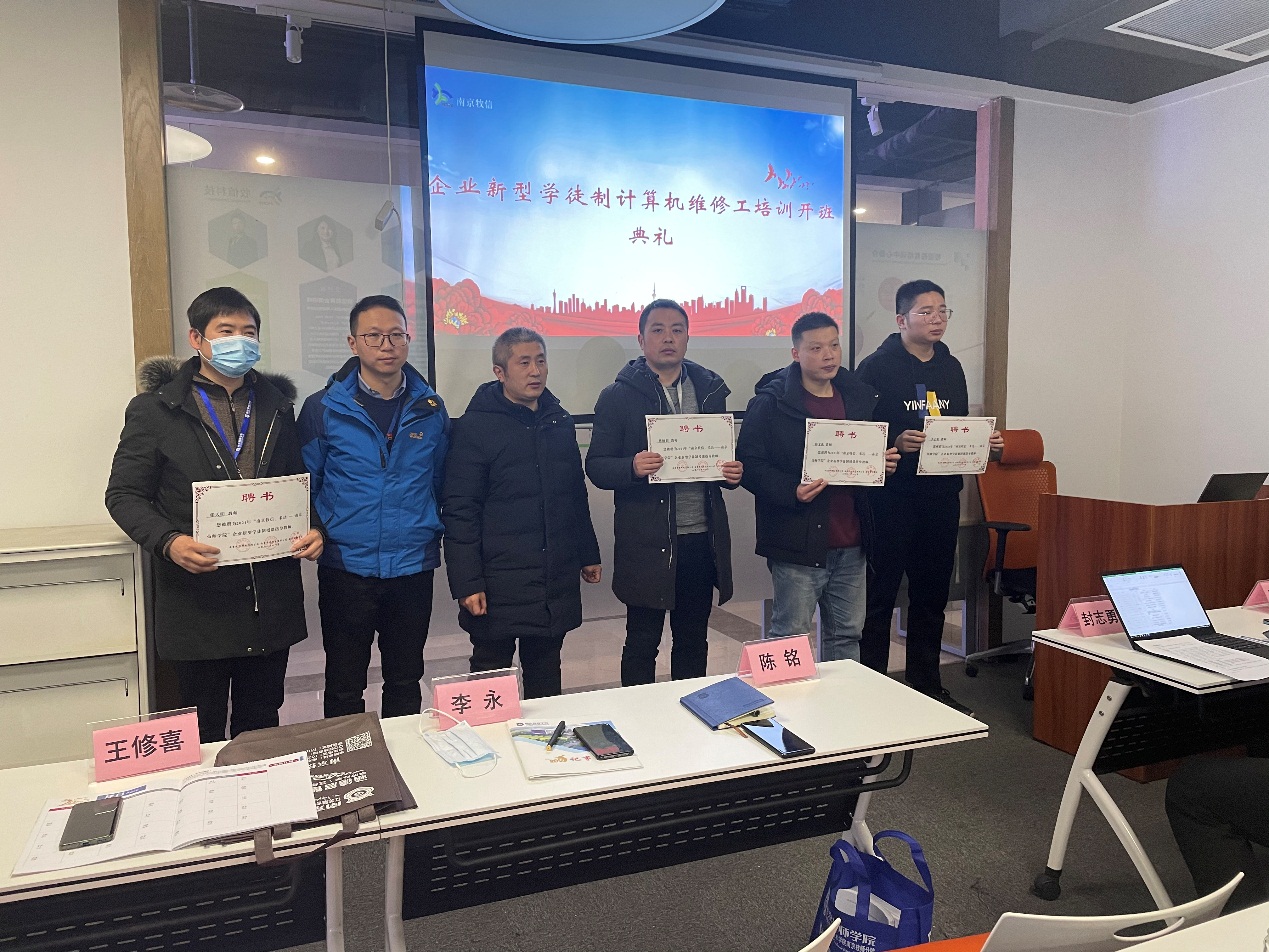 2022年1月11日,MK在线(中国)唯一官方网站在南京牧信科技有限公司(南京禾达信息有限公司)举行了企业新型学徒制培训班的开班仪式。出席本次开班仪式的有牧信科技副总陆冬昀、经理沈碧英、技师学院招生就业处副主任陈铭、信息技术系副主任李永、教师代表王修喜和班主任蔡敏等。两家企业属关联公司在同层办公,因此开班后将采取合班授课形式,一共40名学员参与培训。