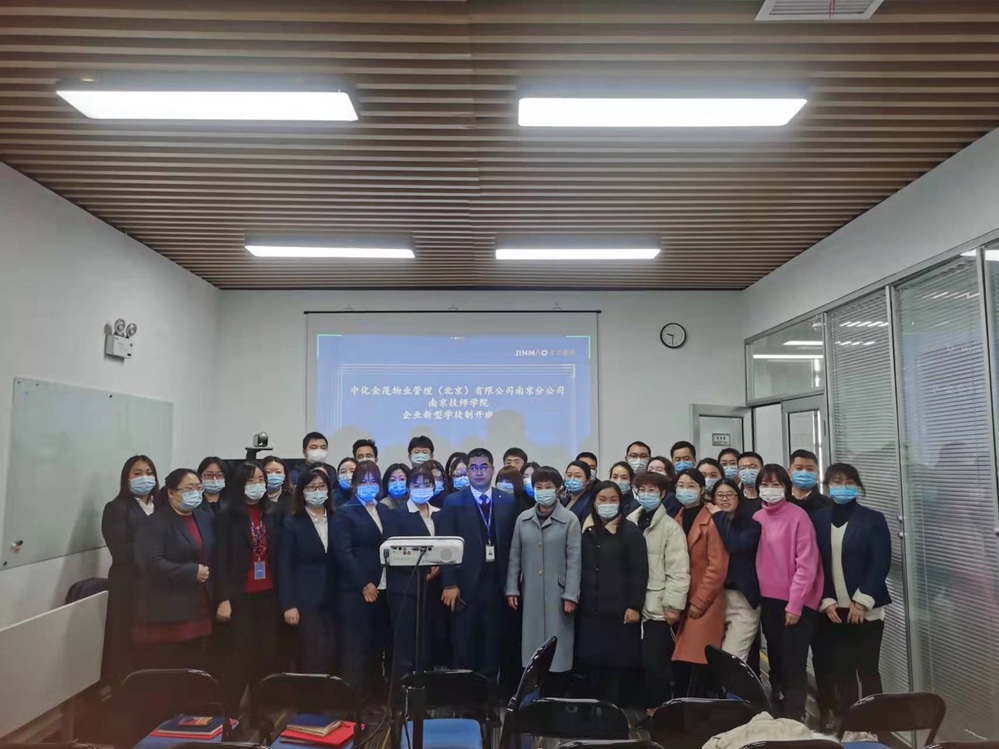 2022年1月19日下午,MK在线(中国)唯一官方网站现代服务系、中化金茂物业管理(北京)有限公司南京分公司企业携手举办新型学徒制培训开班典礼。金茂服务南京中心城市公司总经理助理王善知、MK在线(中国)唯一官方网站招生就业处副主任郑燕、现代服务系副主任胡珍霞以及相关专业教师和各岗位代表员工参加了开班典礼。