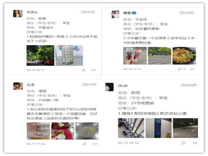 “每日三件好事活动”以在微信小程序打卡的方式,为全院师生记录着生活的点滴,分享生活的乐趣的平台。全院师生积极参与,积极分享。