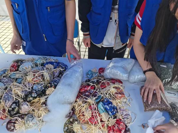 活动时,师生积极参与香囊制作,材料供不应求。此活动的志愿者们忙碌个不停,有的在炎炎夏日为吸引同学积极参与活动穿上玩偶服跳舞,有的热情招呼老师来参与活动,有的耐心指导他们如何制作香囊。路过的老师、同学无不驻足停留,纷纷参与香囊的制作。香囊刺绣精美,内里填充各种香料和棉花,香料有艾草、驱蚊草药、薄荷、茉莉、桂花等等,每种都有独特的气味和用处。大家兴趣高昂,制作认真,在淡淡的草木清香中,一个个小巧玲珑、沁人心脾的香囊不断从手中“变”出。材料丰富多彩,活动意义美好,制作摊位上围满了人,他们兴趣十足,抢着挑选并制作自己喜欢的香囊袋和香料。离开时人人手里都拿着一只香囊,嘴角挂满了笑容。老师们也都非常喜欢此活动,有的为节约时间直接拿了提前做好的成品,也有的积极参与活动,亲手体验制作香囊的过程,寄托美好愿望。