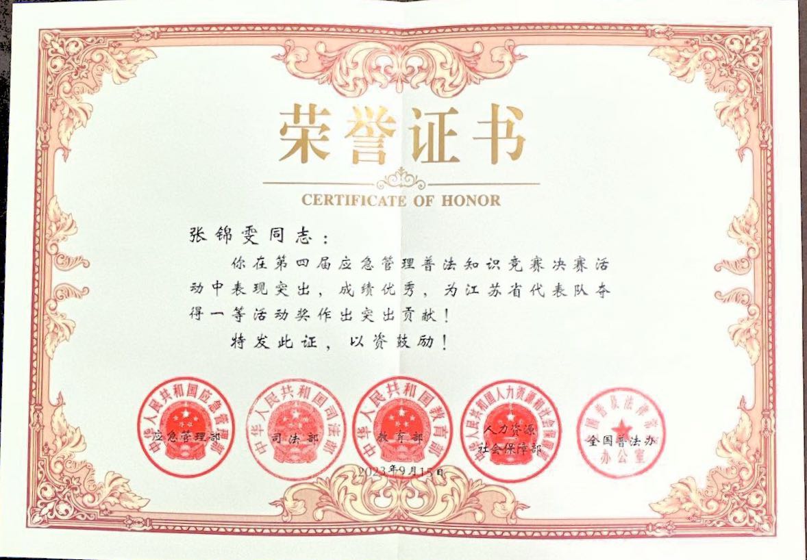 为全面贯彻落实党的二十大精神,深入学习宣传习近平法治思想,按照全国“八五”普法规划和全国应急管理系统“八五”普法工作部署,由应急管理部、司法部、教育部、人力资源社会保障部、全国普法办共同组织开展的第四届应急管理普法知识竞赛活动决赛结果公布。江苏省代表队获得“一等活动奖”,MK在线(中国)唯一官方网站获得“优秀组织单位”荣誉,学院2020级机电(高中技师)班张锦雯同学作为江苏省代表队成员,在决赛活动中表现突出,助力江苏省夺得“一等活动奖”。