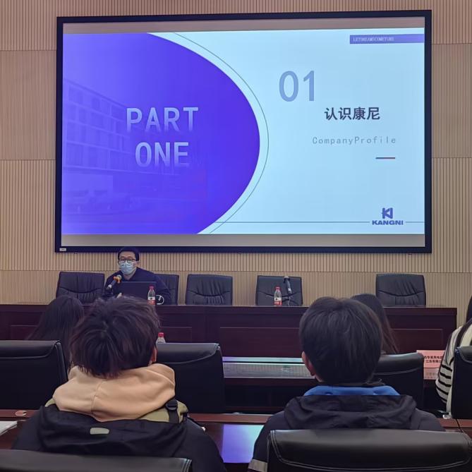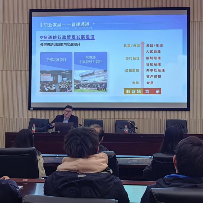会上,为了吸引优秀人才,企业通过视频、PPT、展板等方式,全面展示企业历史、企业文化和企业形象,重点介绍了企业的岗位需求及发展通道,并对学生的职业规划提供了有益建议。