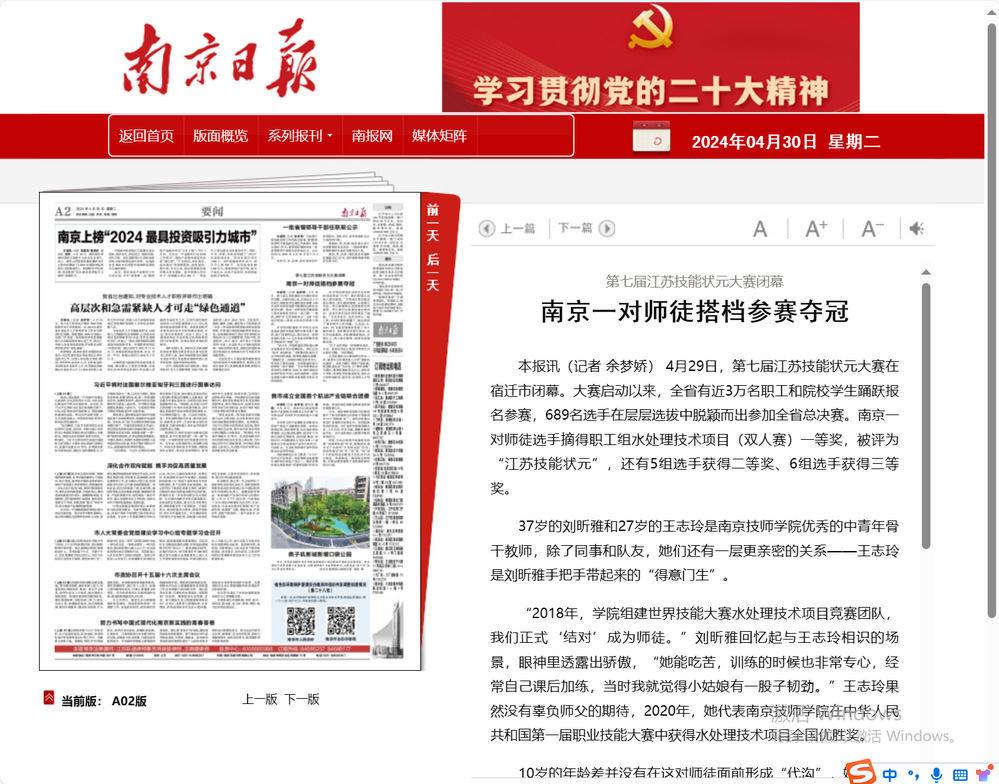 《南京日报》A2版——MK在线(中国)唯一官方网站一对师徒选手摘得第七届江苏技能状元大赛职工组水处理技术项目(双人赛)一等奖